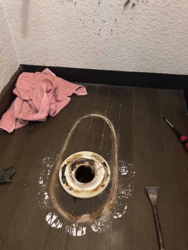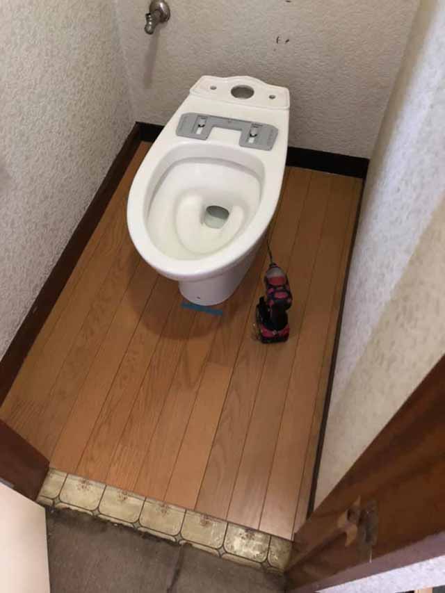 既存のトイレから排便管位置移動と床フロア交換実施、トイレ設置です。